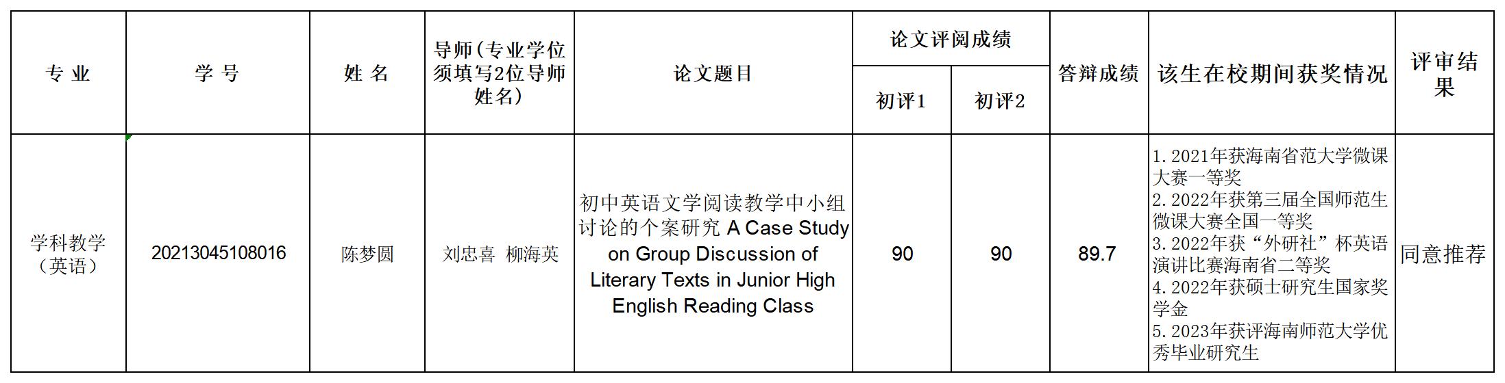 为做好2024年海南省优秀硕士学位论文评选推荐工作,经外国语开元网页版学位评定委员会评审,拟推荐2021级学科英语专业陈梦圆同学的毕业论文《初中英语文学阅读教学中小组讨论的个案研究》参与2024 年海南省优秀硕士学位论文评选。现将有关事项公示如下: