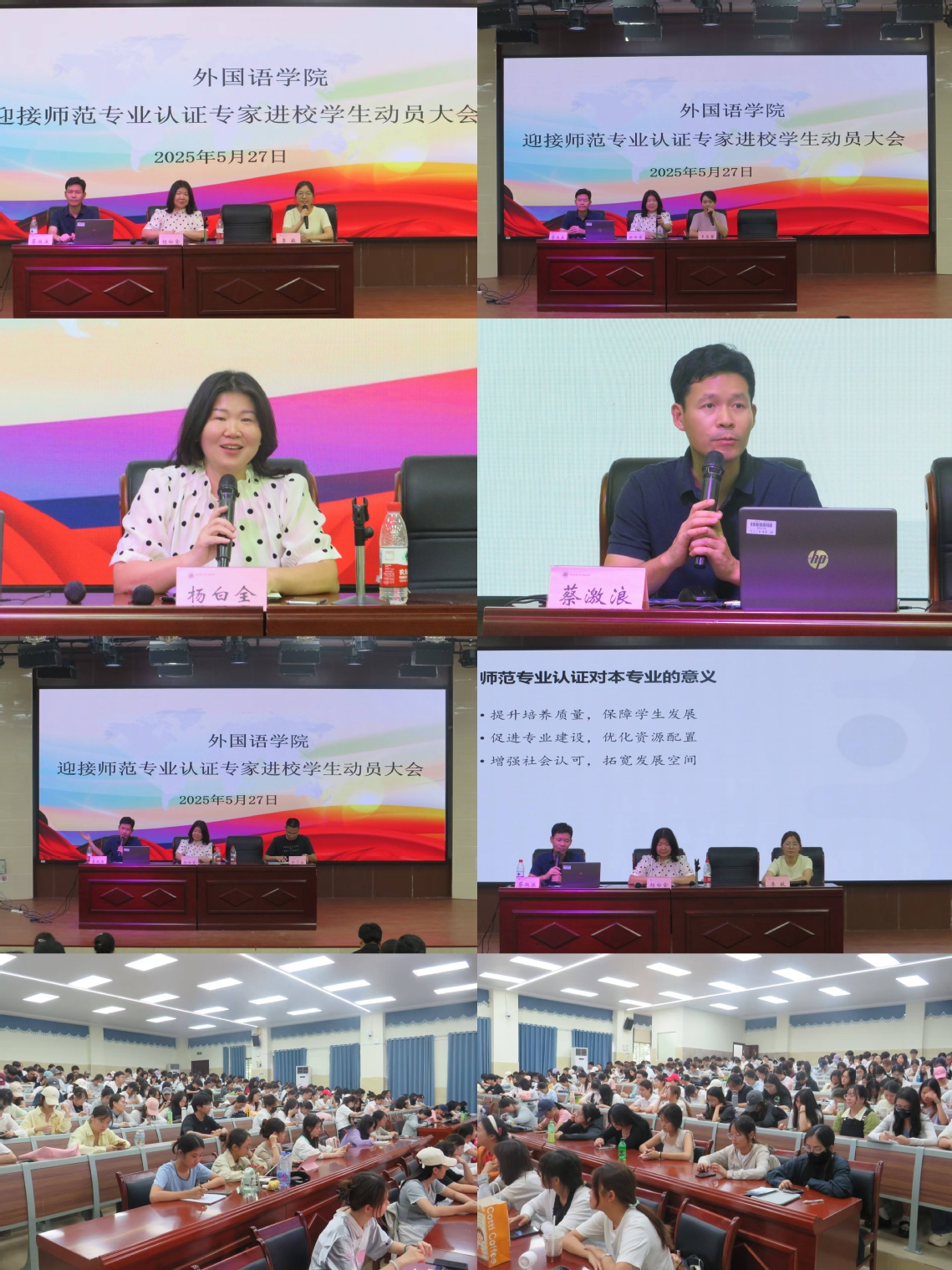 为迎接2025年英语(师范)专业认证专家进校考查,5月27日,海南师范大学外国语开元网页版于外语楼110报告厅分批召开学生动员大会。出席本次大会的有外国语开元网页版党委副书记杨白全、副院长蔡激浪及各年级辅导员。外国语开元网页版22级、23级、24级全体本科生分批参会。