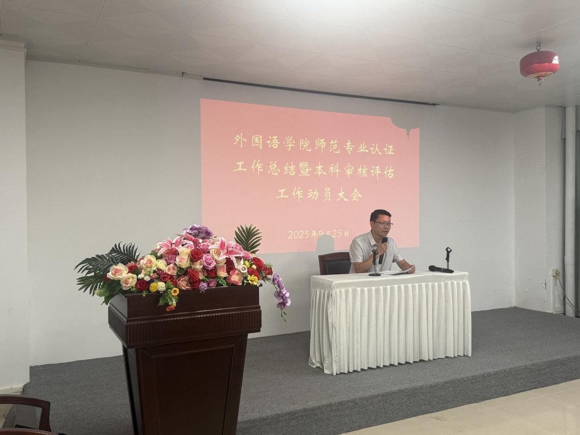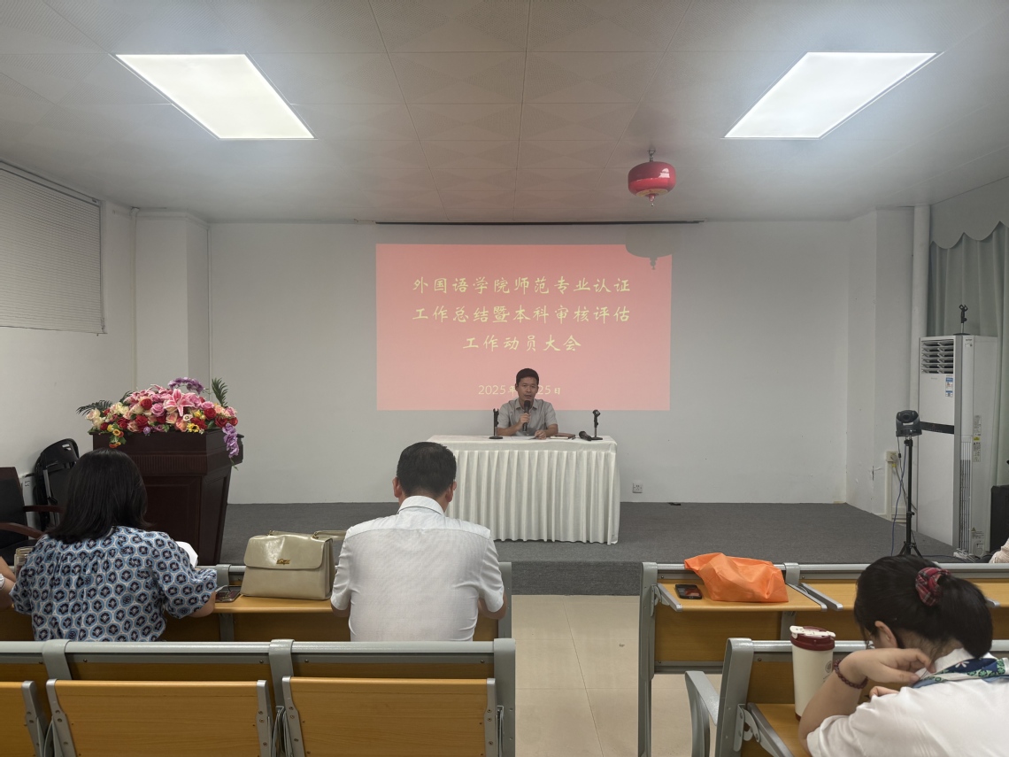 2025年9月25日下午三点,为全面总结师范专业认证工作经验,迎接本科审核评估工作,外国语开元网页版在实验二楼案例研讨室召开师范专业认证工作总结会暨本科审核评估工作动员大会。开元网页版全体教职工参加会议。本次会议由刘忠喜院长主持。会议分为四项议程。