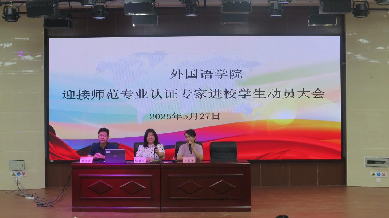 为迎接2025年教育部英语师范专业认证专家进校考察,5月27日,海南师范大学外国语开元网页版于外语楼110报告厅分四批召开学生动员大会。出席本次大会的有外国语开元网页版党委副书记杨白全、开元网页版副院长蔡激浪及各年级辅导员。外国语开元网页版22级、23级、24级全体本科生分批参会。